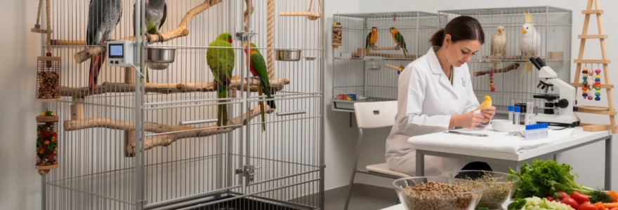 La quarantaine implique d’isoler le nouvel arrivant dans une pièce séparée, sans contact direct ni indirect (poussières, matériel partagé) avec vos autres oiseaux, pendant une période d’au moins 30 jours, idéalement 45. Durant ce laps de temps, vous observez attentivement son comportement, son appétit, la qualité de ses fientes et de son plumage. C’est également le moment idéal pour réaliser un bilan vétérinaire complet : examen clinique, coprologie, éventuellement analyses sanguines ou tests spécifiques selon l’origine de l’oiseau.